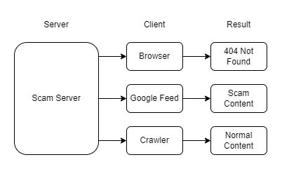 해답은 역시 HTTP 헤더입니다. 구글과 같은 검색 엔진의 크롤러는 HTTP 헤더에 유니크한 User-Agent 를 가집니다. 이런 사기 사이트들은 크롤러가 접근할 때에만 정상적인 컨텐츠를 반환하고, 사용자가 접근할 때는 사기 컨텐츠를 반환하는 방식을 사용합니다.