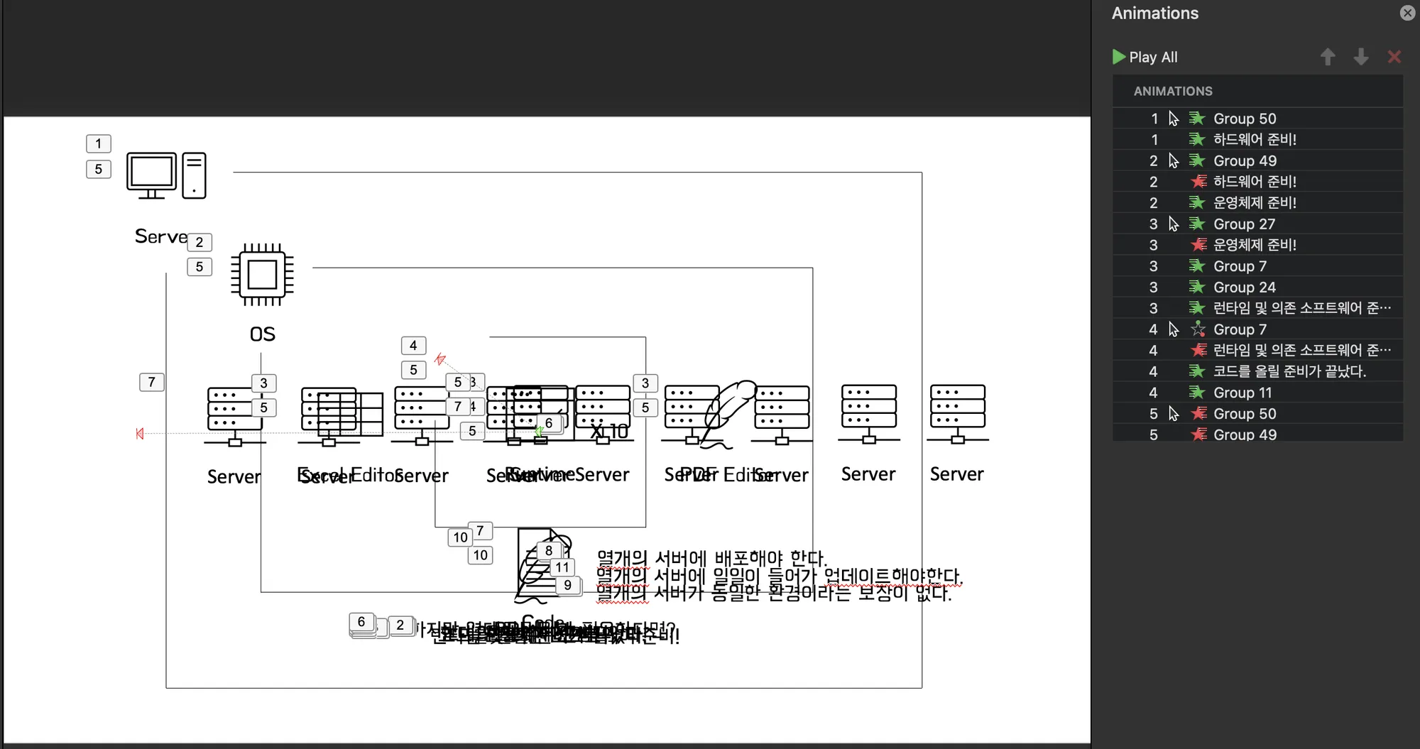 위 프레젠테이션을 표현하기 위해 사용된 애니메이션은 물체의 이동과 Fade In/Out 효과가 대부분입니다. 하지만 이를 작성하기 위해 실제 작성된 PPT 파일을 열면 아래와 같은 형태로 작성되어 있습니다.